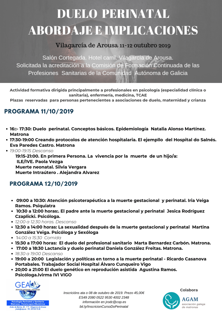 Necesitamos una formación y actualización constante; que nos permita compartir espacios, conocimientos y visiones; tanto entre profesionales como con las propias madres; padres…familias que tienen que decir adiós demasiado pronto a sus hijos e hijas; por este motivo, los días 11 y 12 de octubre de 2019; Gea Atención Perinatal y Psicología, contando con la colaboración de la Asociación Galega de Matronas celebrará el curso: